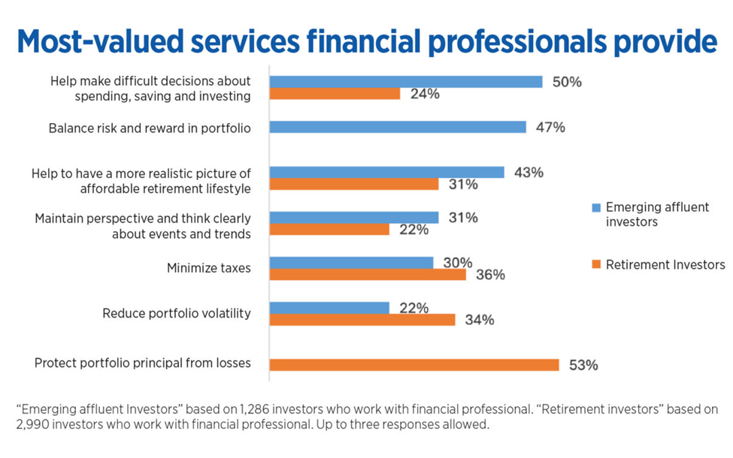Research consistently shows that affluent investors value clarity and perspective over performance alone. In fact, when asked what they value most from financial professionals, investors prioritize help with decision-making, risk balance, and maintaining clear perspective—especially as retirement approaches.