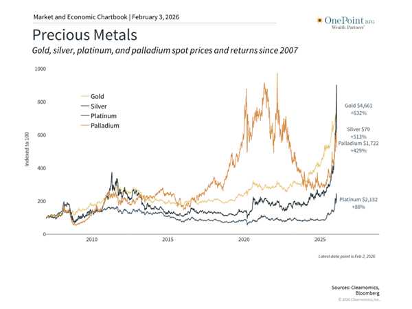 This reversal highlights both the susceptibility of precious metals to boom-and-bust patterns and illustrates how rapidly markets can pivot based on policy expectations. While precious metals can benefit portfolios, their volatility throughout January illustrates why they should complement, rather than substitute for, foundational holdings in equities and fixed income.